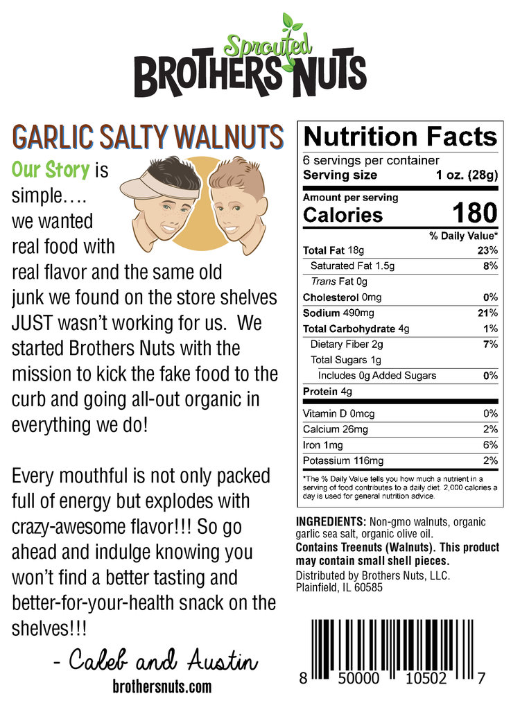 Has simple been so good? Do not be afraid to look at the ingredients, you will find 3 of them, all of which you probably have in your kitchen right now!! These walnuts are simple, salty and tasty. The combination of USDA certified walnuts and ingredients alongside the sprouting process ensures health. We put a twist on the plain salted walnuts, now with a kick of garlic. Not only does the garlic give flavor but it also gives cancer and heart disease fighting properties. Reach for these whenever you have a savory craving.
